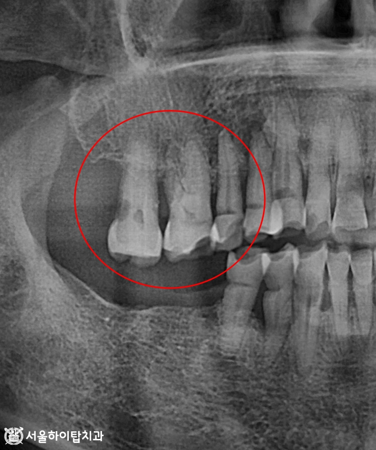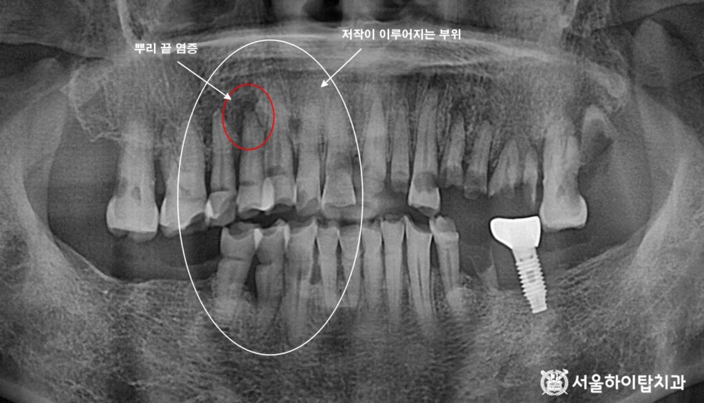 장기적으로는 발치가 불가피한 상태임을 시사합니다.