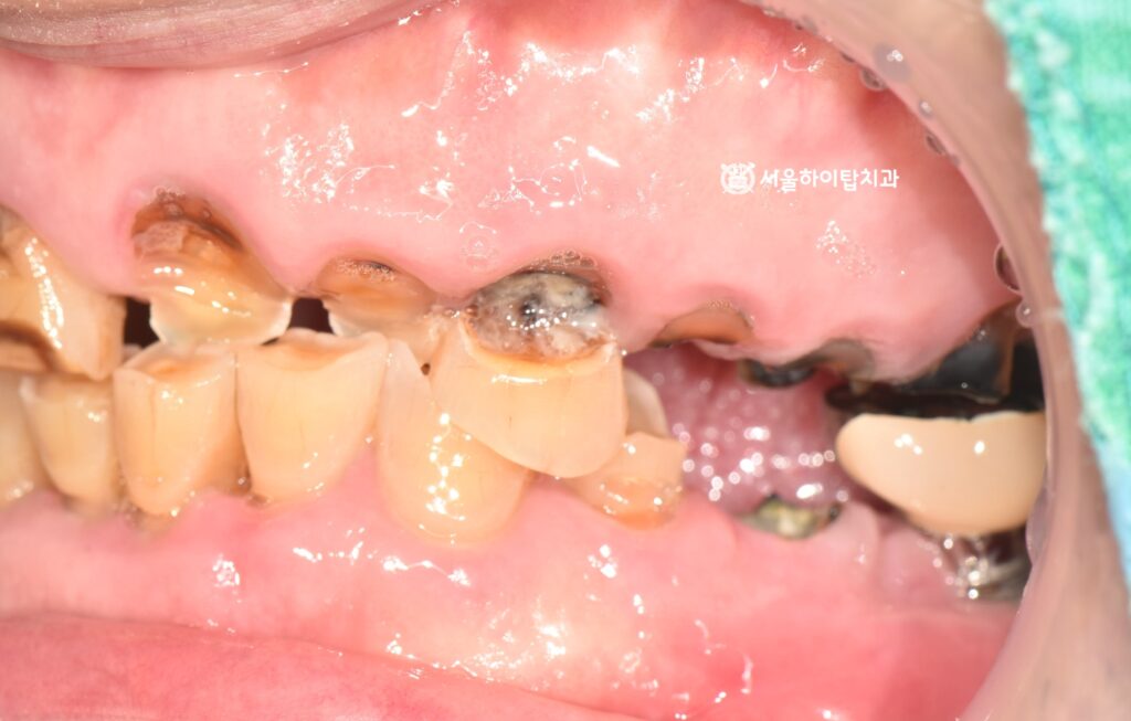 전반적으로 치아와 잇몸 상태가 매우 좋지 않은 것을 알 수 있습니다.