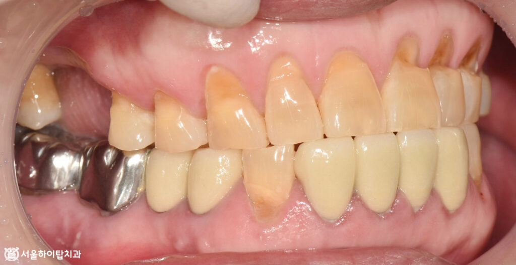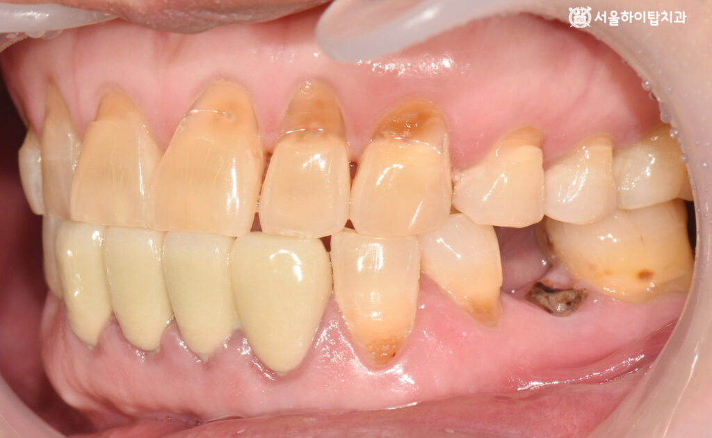 상실되고 심하게 훼손된 자연치를 확인할 수 있습니다.